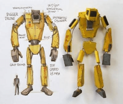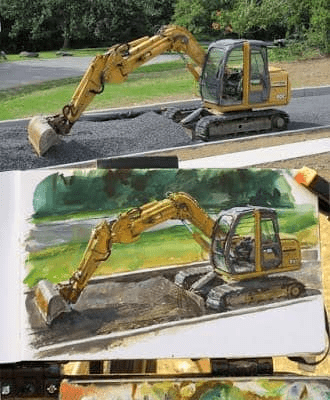 The robot painting takes me to several locations, including a construction site and a fast-food streetscape. I spend some time doing gouache studies of the excavators to understand the mechanics.